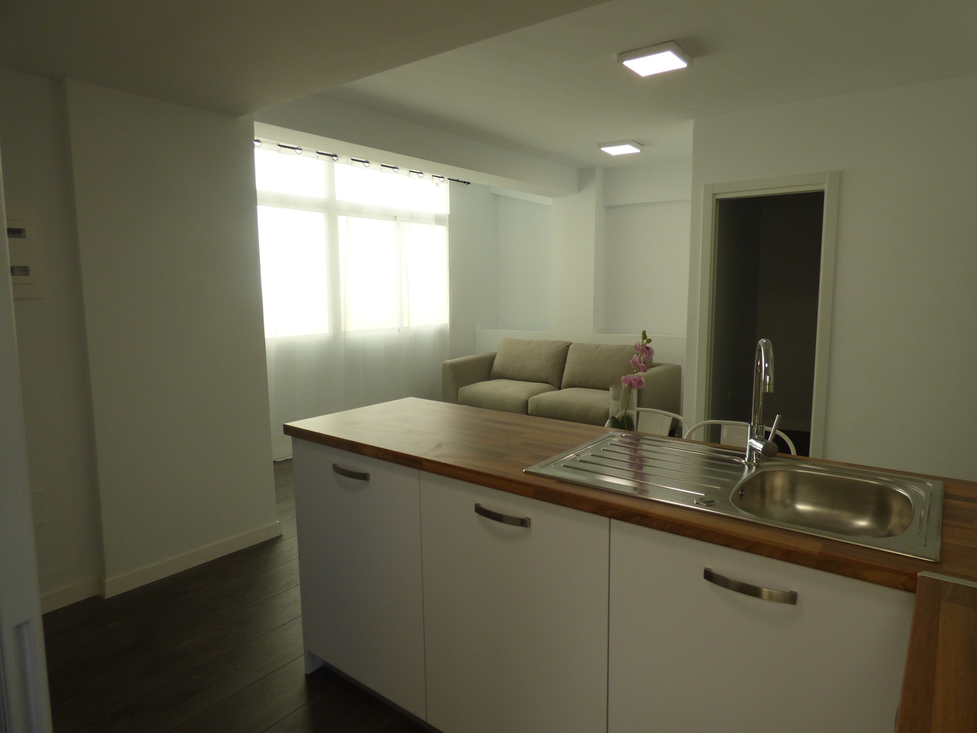 Apartamento frente a la Catedral de Almería. Se realizó un magnífico rediseño en el que se priorizó una cocina abierta conectada con el salón y un pequeño patio. El resultado fue un impresionante apartamento de dos dormitorios, ideal tanto para alquiler turístico como para estancias de larga duración.